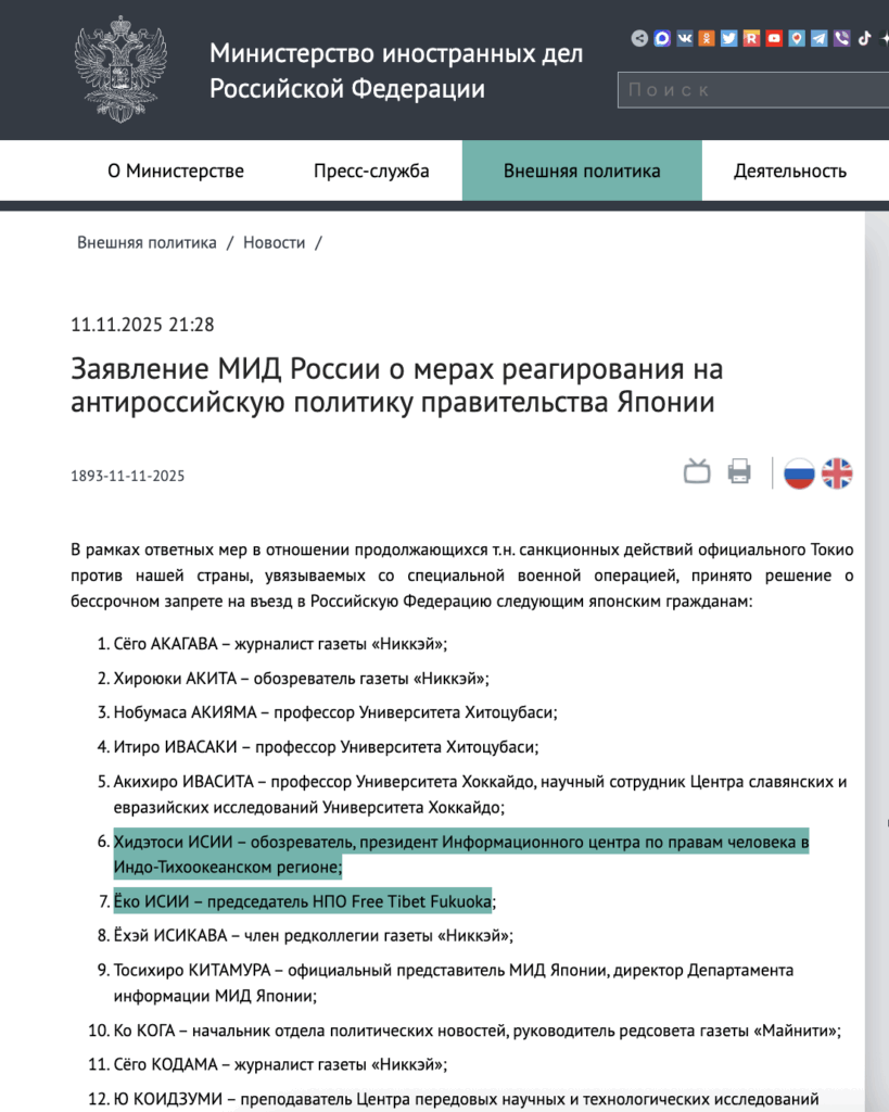 [ウクルインフォルム通信 2025/11/11] ロシア、日本記者・学者等30人を入国禁止指定 ウクルインフォルム編集者も